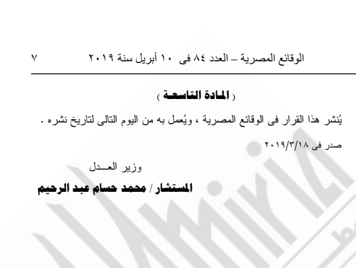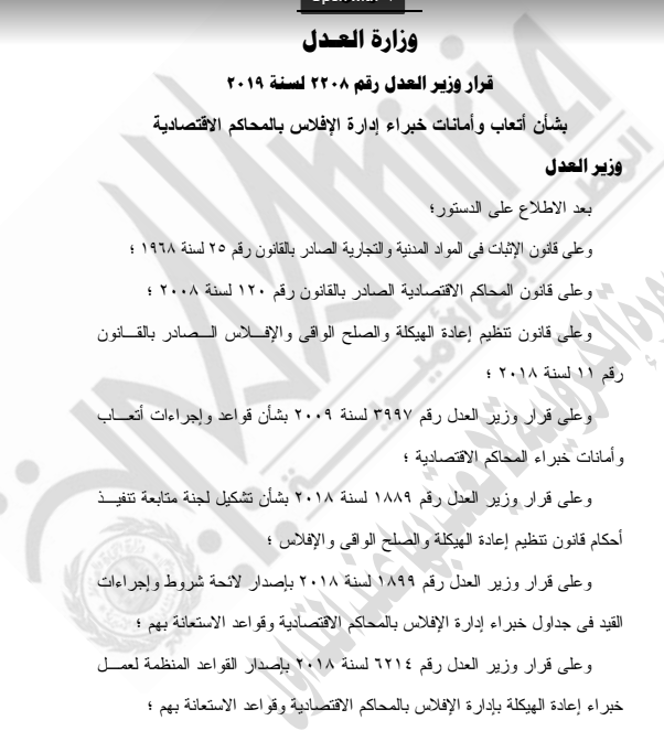 نشرت الجريدة الرسمية في 10 أبريل 2019 قرارًا من المستشار حسام عبد الرحيم، وزير العدل، بشأن تحديد أتعاب وأمانات خبراء إدارة الإفلاس بالمحاكم الاقتصادية.