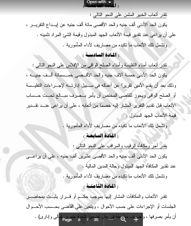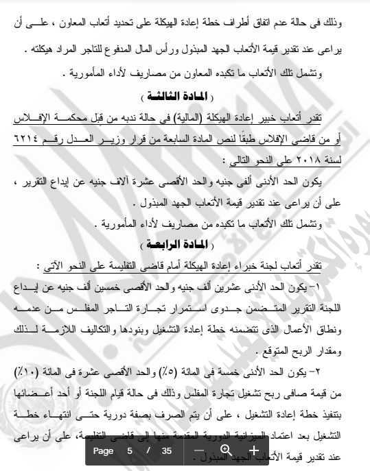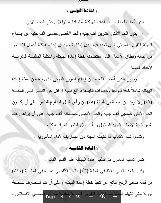 • الحد الأدنى لأتعاب لجنة الخبراء وإعادة الهيكلة أمام إدارة الإفلاس هو 20 ألف جنيه.